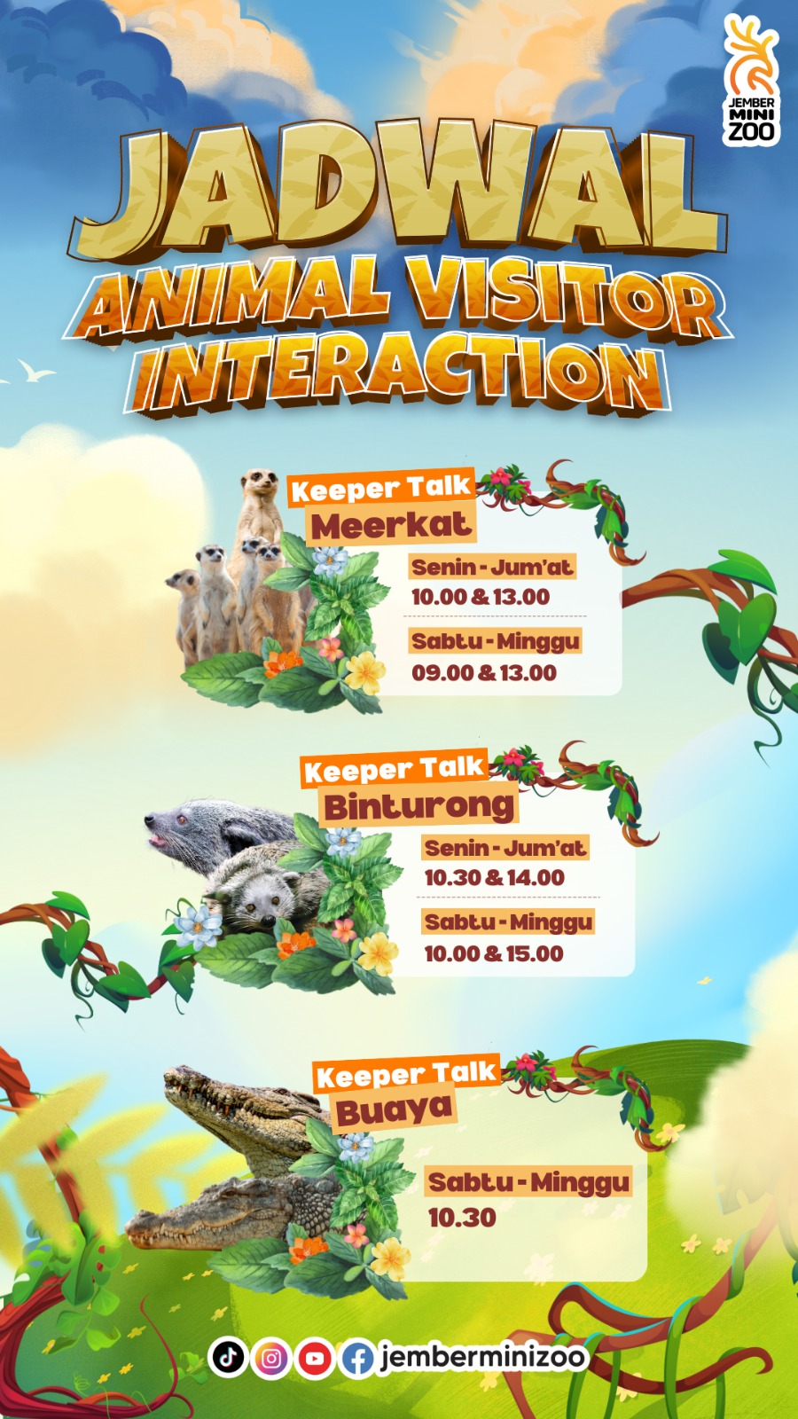 Jember Mini Zoo kini semakin diminati sebagai destinasi edukasi dan rekreasi bersama orang tersayang, keluarga dan kerabat loh! Salah satu program baru dari Jember Mini Zoo yang menjadi daya tarik sobat Jemi adalah Animal Interaction, di mana sobat Jemi dapat belajar lebih dalam mengenai satwa dari para zoo keeper yang profesional. Terdapat tiga satwa unggulan dalam program Animal Interaction Keeper Talk: Meerkat, Binturong dan Buaya.